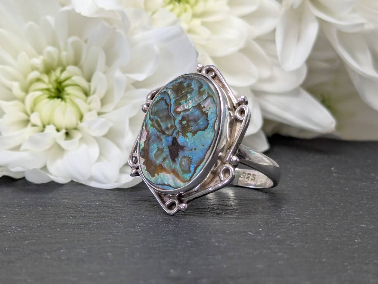 This beautiful Abalone Shell sterling silver ring is in pre-loved vintage condition. Which means it has been loved and worn by someone before, so you might see some signs of age and wear. These little marks and scratches make each piece unique and give it special character. Vintage jewellery tells a story, and its history makes it even more special! If you appreciate the charm of older items, you will surely enjoy wearing this one.