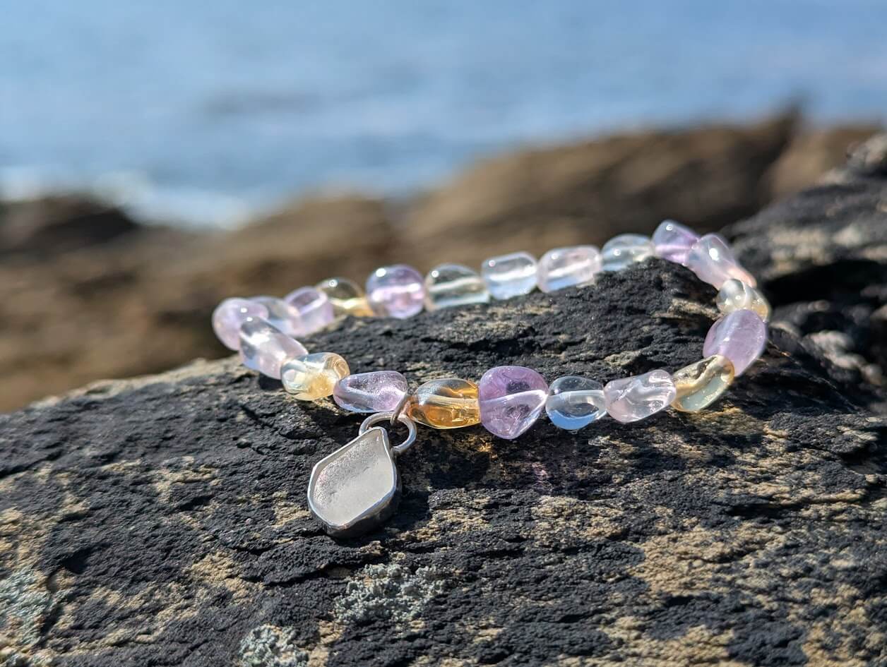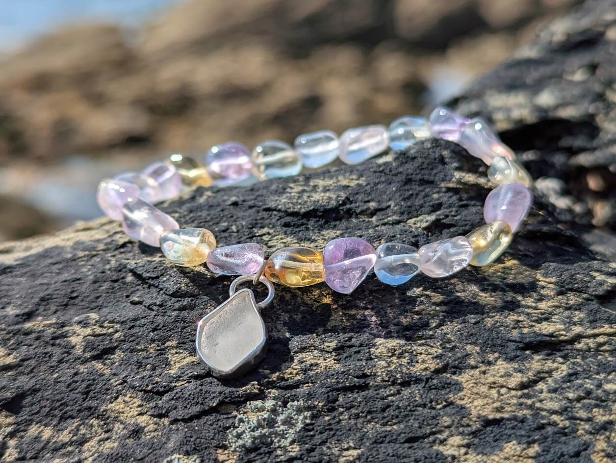 Handmade with assorted sizes of Ametrine gemstone beads, set on strong jewellery elastic, just roll onto your wrist and roll off, no tricky clasps. The white sea glass charm were found on the south coast of Cornwall. The sea glass charm measures approx. 13 mm by 9 mm.