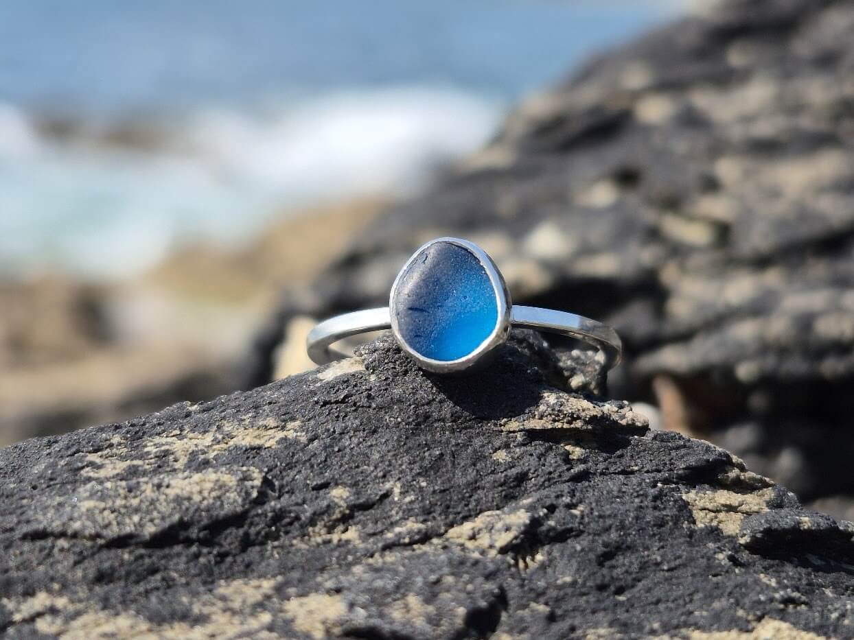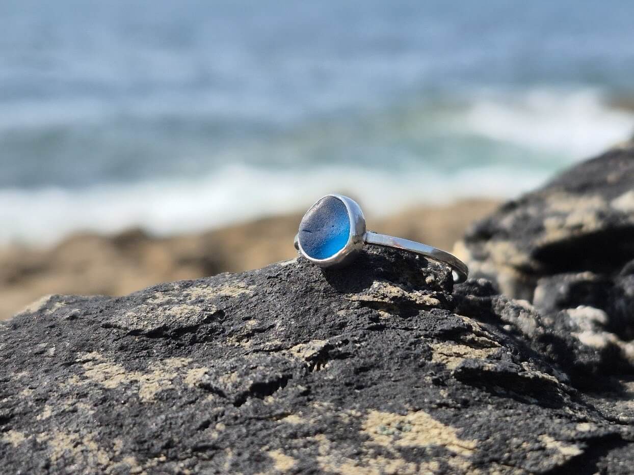 Handmade using traditional Silversmithing techniques set with a beautiful piece of Blue coloured Cornish sea glass, which measures approx. 7 mm x 6 mm.