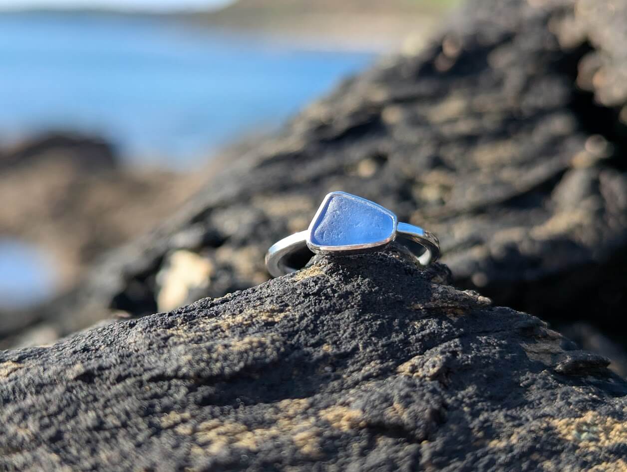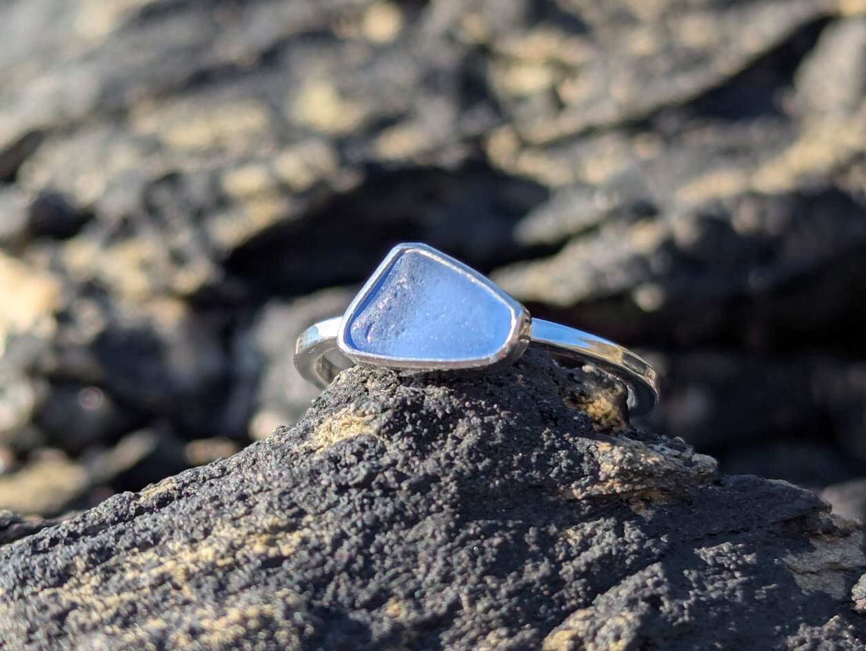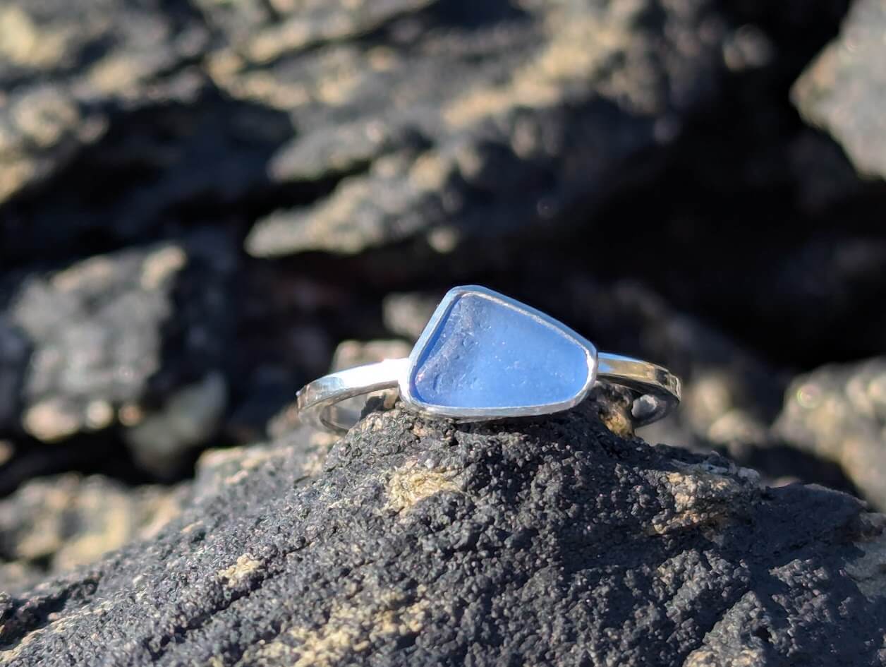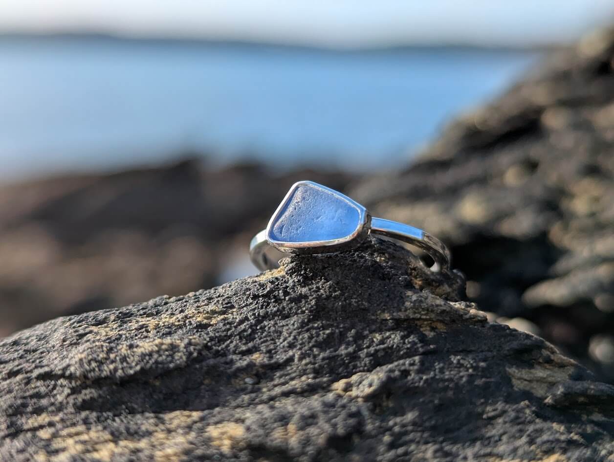 Cornish Sea Glass Ring set on a 1.2 mm square Sterling Silver band – Size P