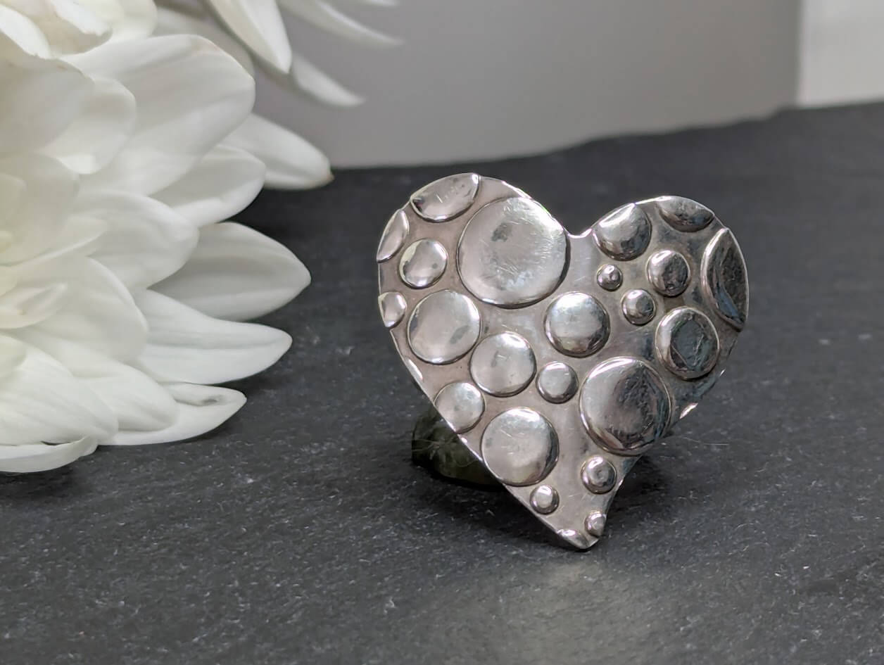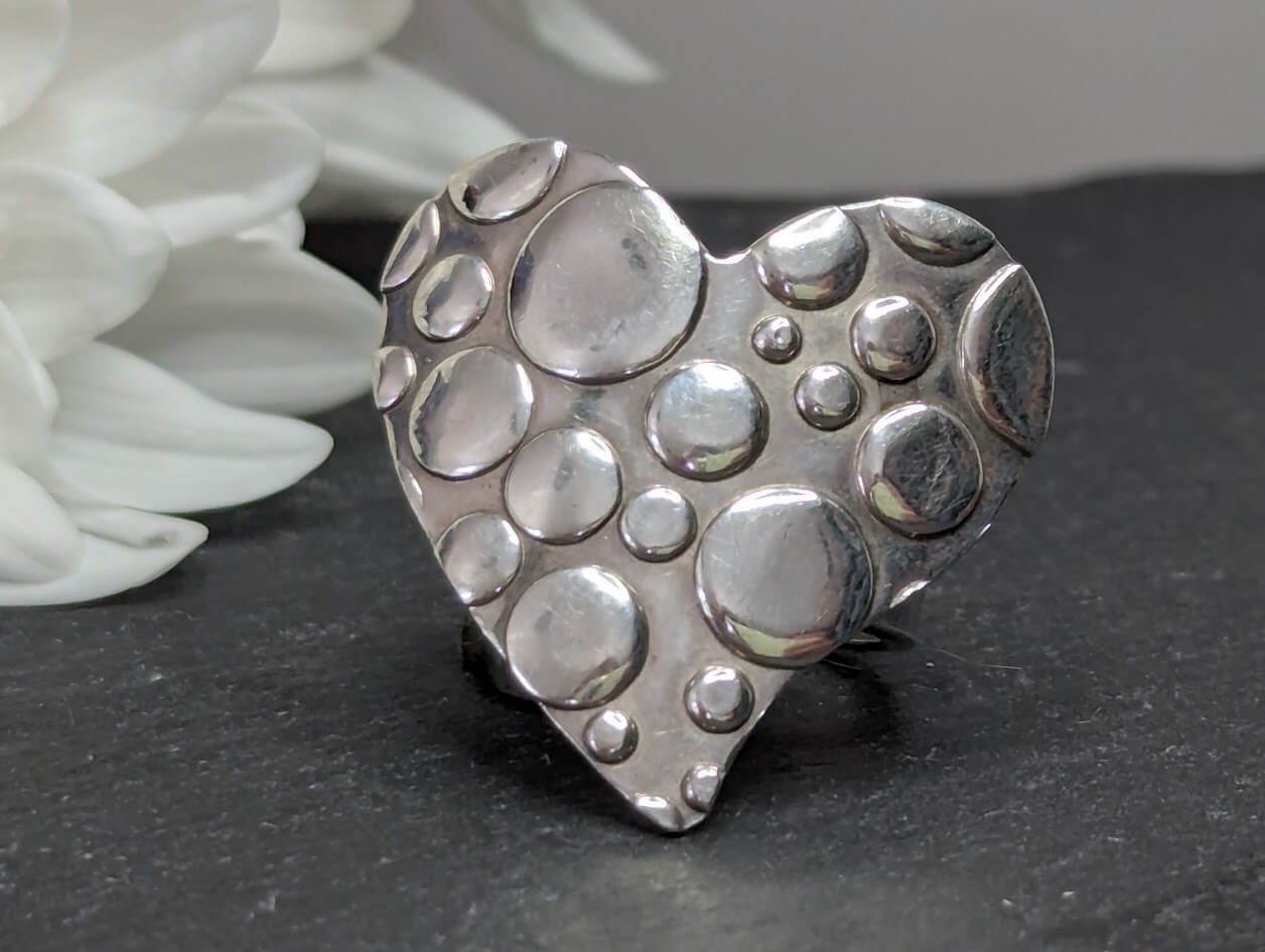 This beautiful sterling silver heart ring is in pre-loved vintage condition. Which means it has been loved and worn by someone before, so you might see some signs of age and wear. These little marks and scratches make each piece unique and give it special character. Vintage jewellery tells a story, and its history makes it even more special! If you appreciate the charm of older items, you will surely enjoy wearing this one.