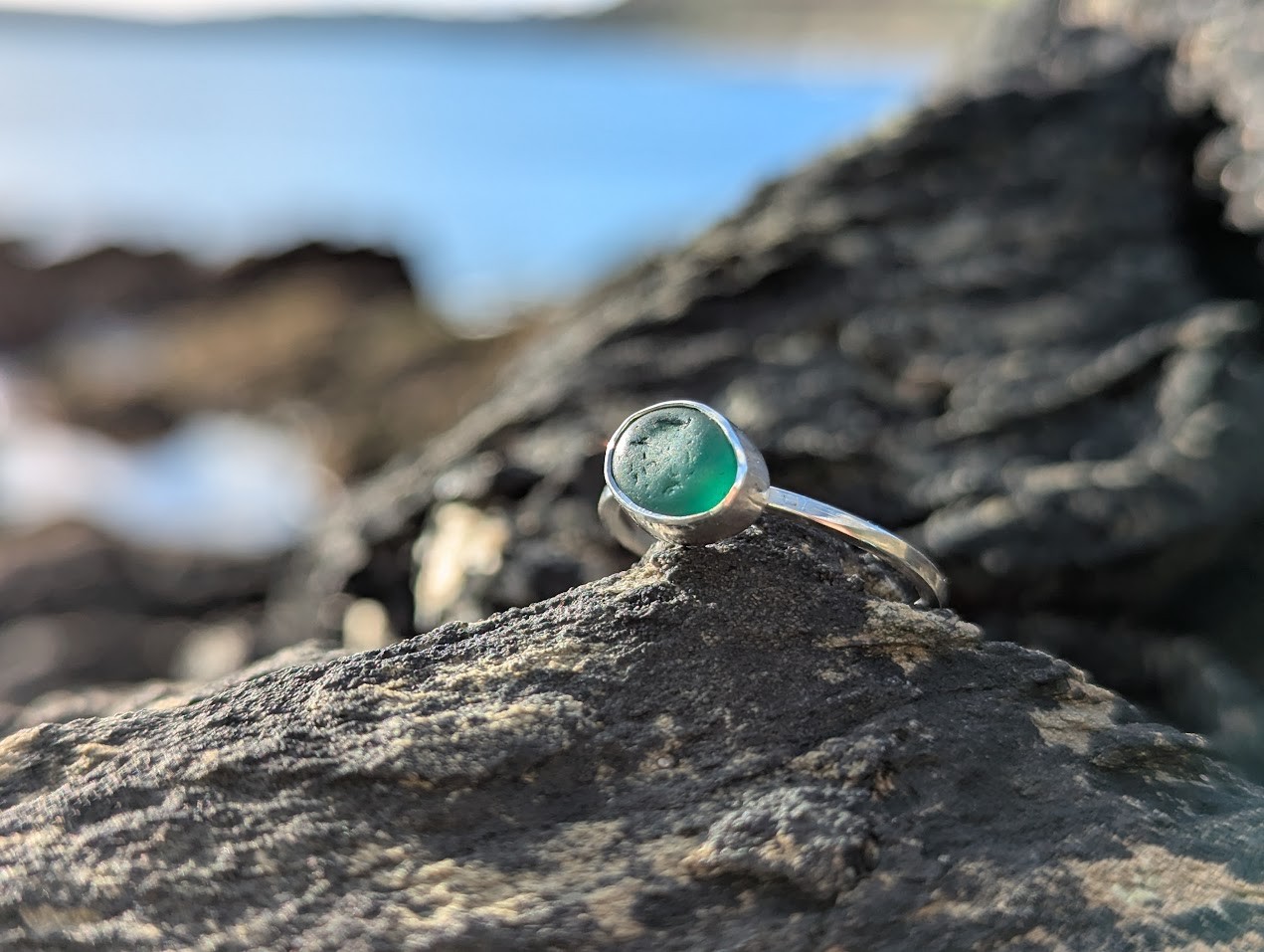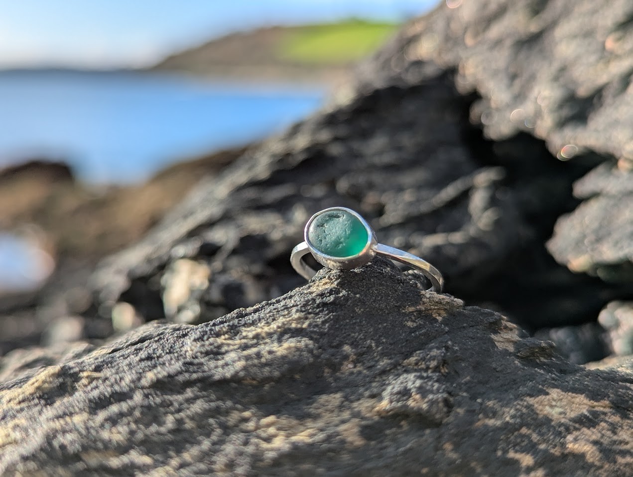 Handmade using traditional silversmithing techniques set with a beautiful piece of green Cornish sea glass, which measures approx. 9 mm x 7 mm.