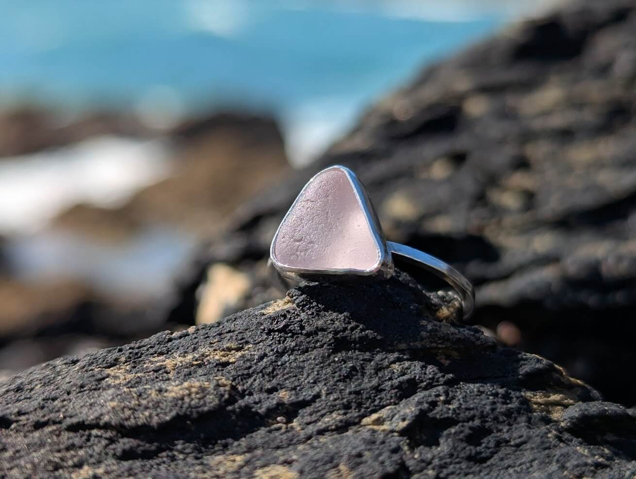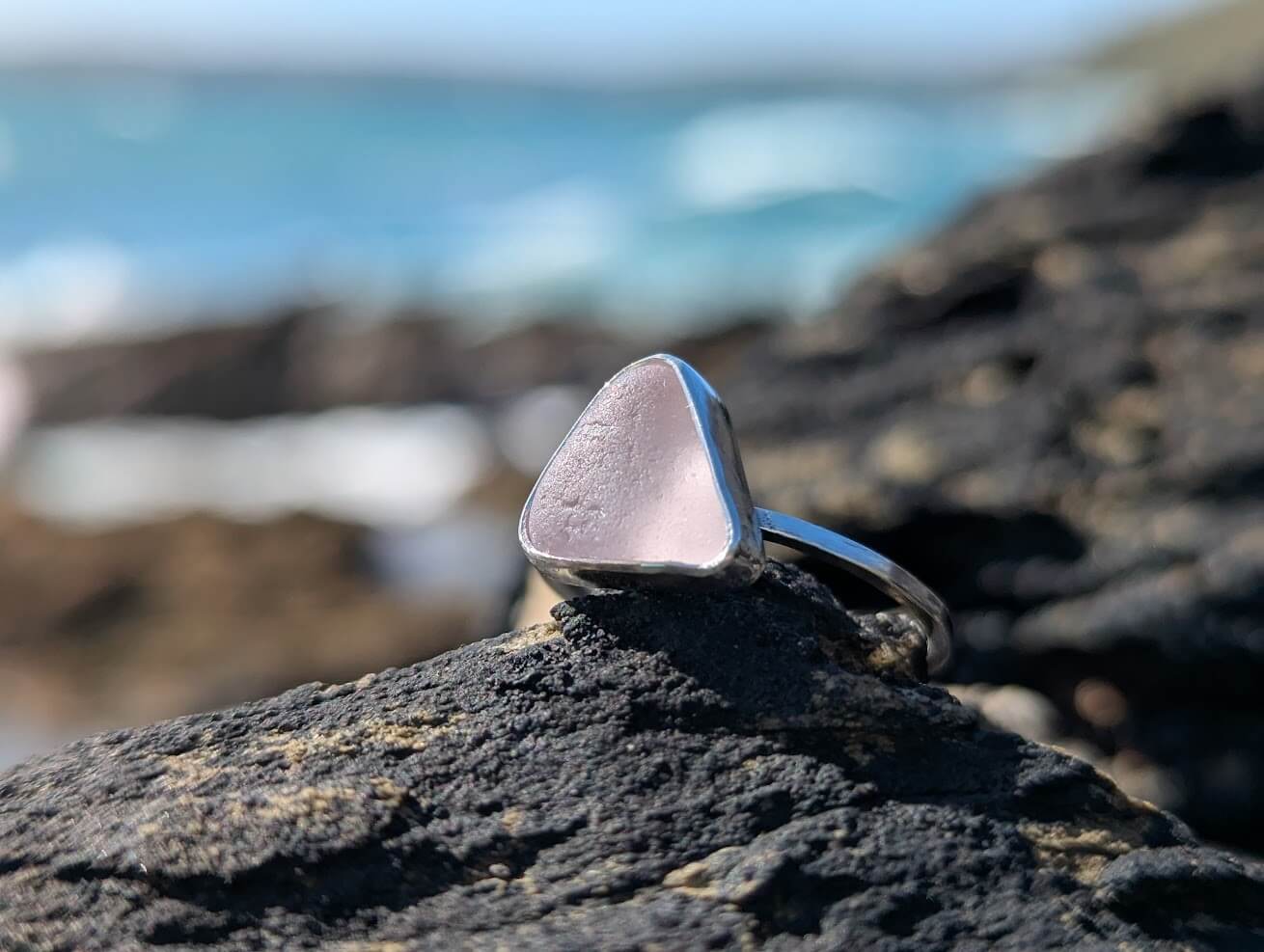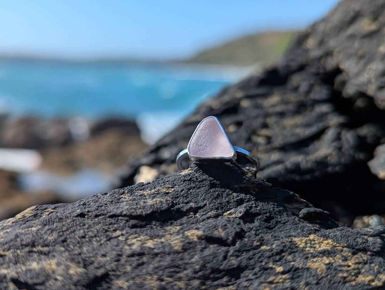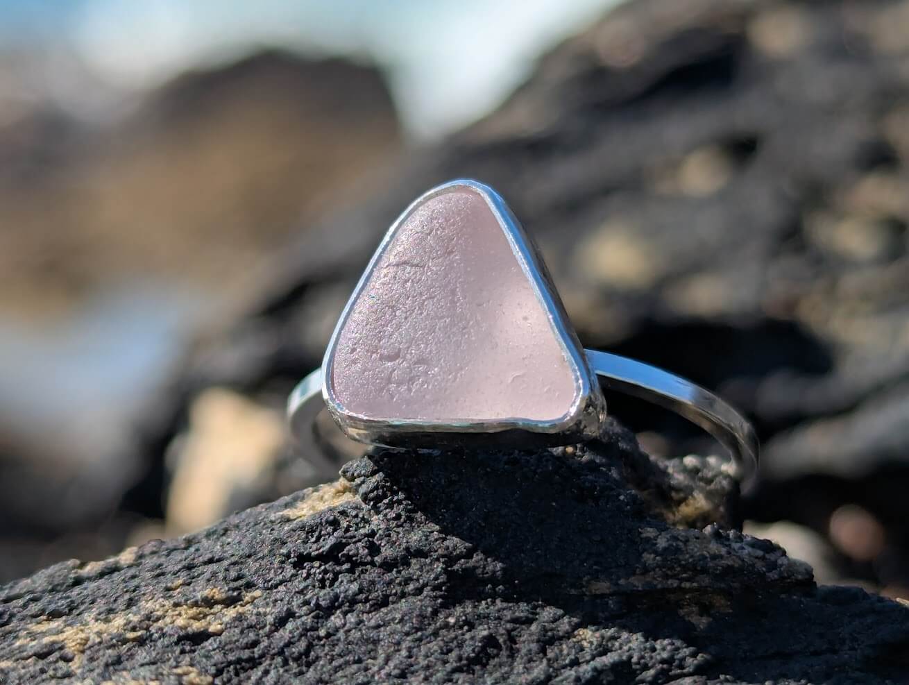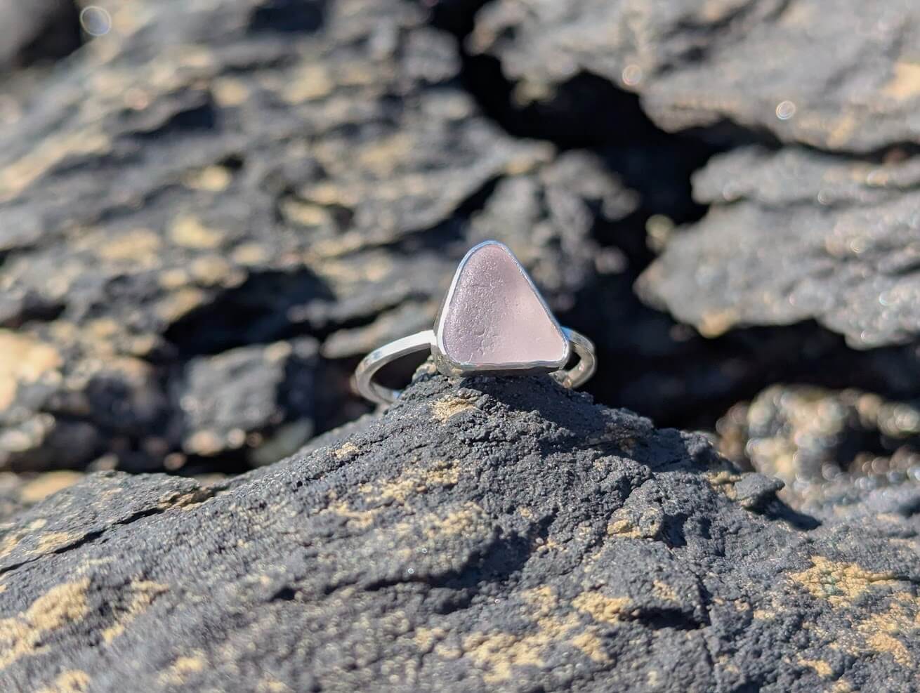 Lilac Sea Glass set on a 1 mm square Sterling Silver ring – Size N