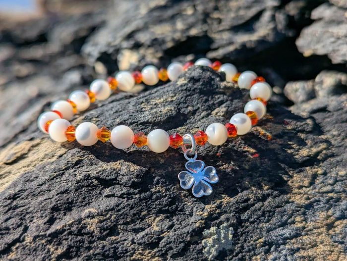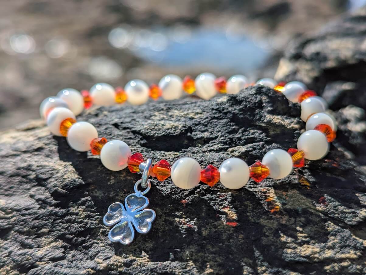 Vibrant Swarovski crystal fire opal & mother of pearl bead bracelet with a 925 sterling silver four leaf clover charm.